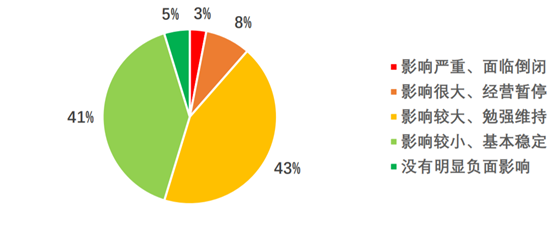 《调查报告》显示:“54%的调查企业反映疫情对企业造成较大影响,勉强维持生产经营。3%的企业反映影响严重,可能出现破产倒闭风险。除需求下降、库存积压和物流受阻等问题外,线下交易停摆、资金短缺和经营成本上升,也是当前产业恢复和企业复工复产中迫切需要解决的问题。”